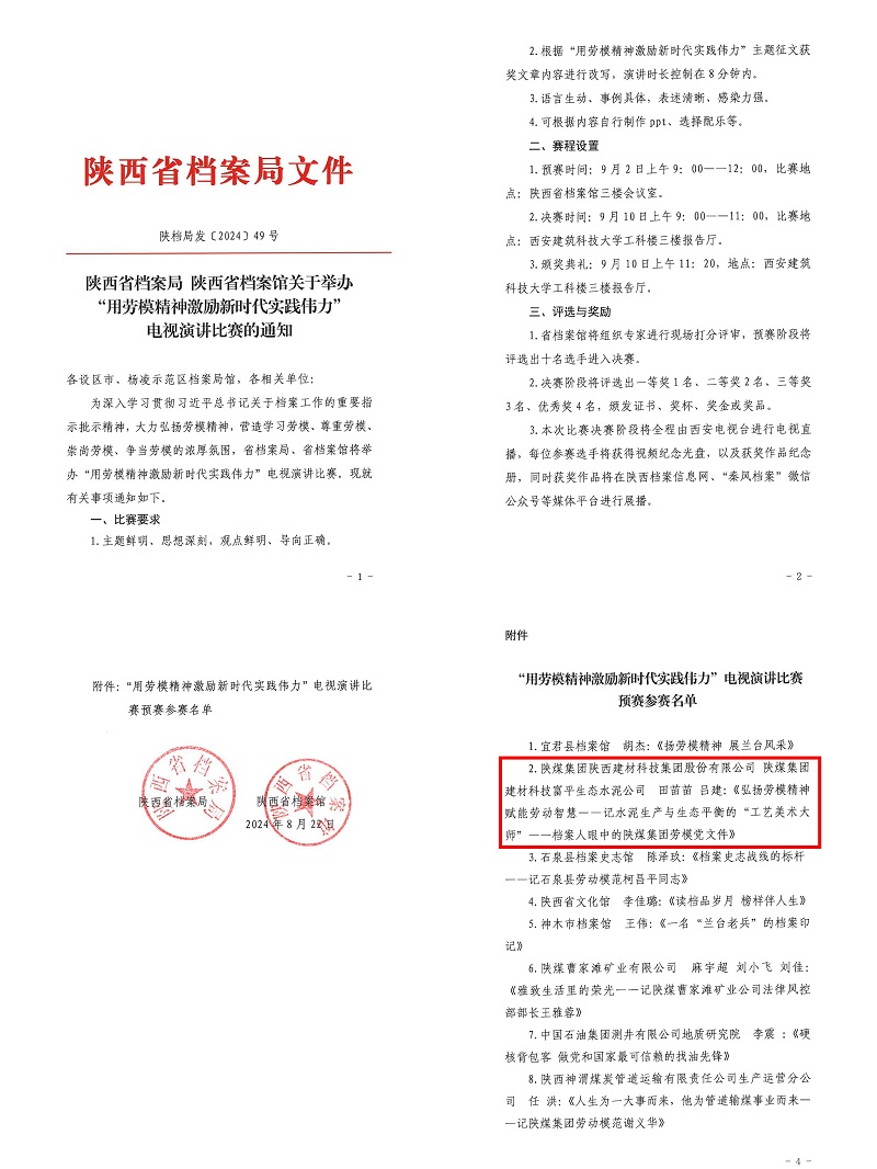 據(jù)悉,此次活動為以檔案人視角大力弘揚(yáng)勞模精神,營造學(xué)習(xí)勞模、尊重勞模、崇尚勞模、爭當(dāng)勞模的濃厚氛圍。比賽決賽階段將全程由西安電視臺進(jìn)行電視直播,同時(shí)獲獎作品將在陜西檔案信息網(wǎng)、“秦風(fēng)檔案”微信公眾號等媒體平臺進(jìn)行展播。