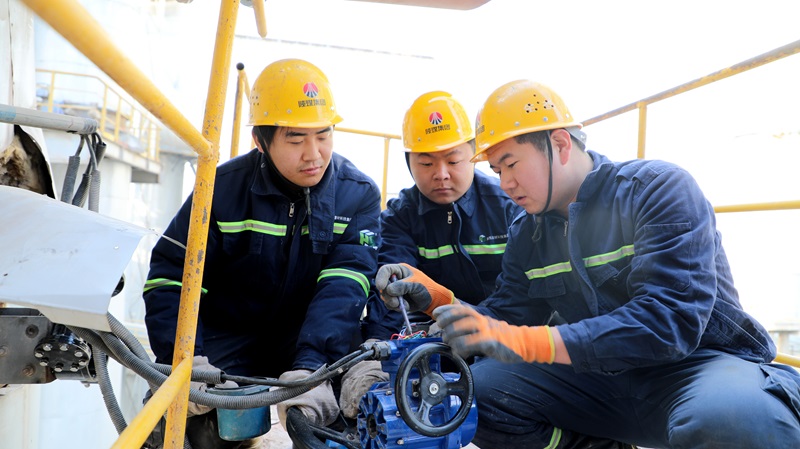 傳承——在神木固廢綜合利用項目現場,由富平公司前來援建的“師傅”陳軍偉(圖中)正在向“徒弟”胡寶銀、李楊(左一、左三)講解鉸刀的工作原理。新春期間,師徒三人在教與學中度過了別樣春節。